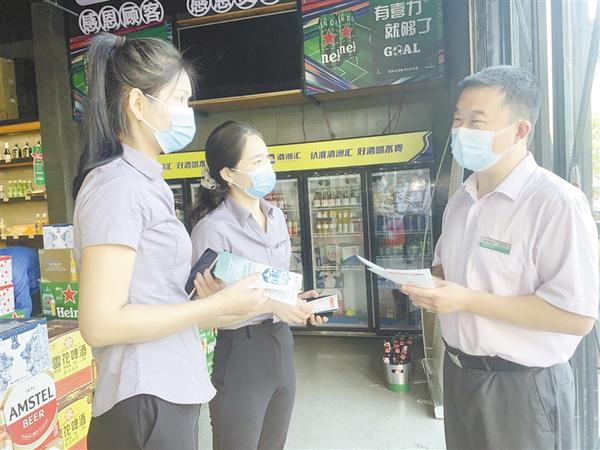 6月17日, 农行周口莲花支行工作人员在市区工农路酒洲汇门店,向员工详细介绍《防范和处置非法集资条例》,提醒店员增强防范意识。近日,农行周口分行贯彻周口银保监分局和上级行工作要求,开展“守护钱袋子·护好幸福家”防范非法集资集中宣传月活动。网点工作人员深入社区向群众发放宣传折页、讲解防范知识,提高群众对非法集资危害性的认识。
