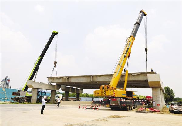 本报讯 6月21日,骄阳如炙,濮新高速公路郸城县巴集乡境内施工现场热火朝天,跨文昌大道立交桥桥梁架设工作有序进行。记者在现场看到,施工人员大战正酣,为确保项目早日建成通车贡献着力量。