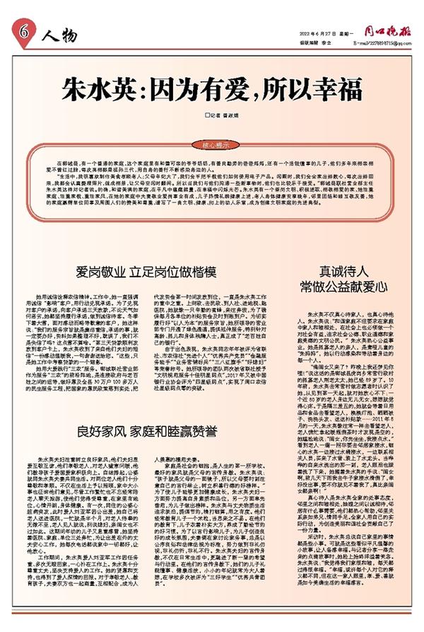 采访时,朱水英总说自己家里的事情都是些小事。可就是这些看似平凡温馨的小故事,让人备感幸福。与记者分享一路走来的点滴故事时,她脸上始终洋溢着笑容。朱水英说:“我觉得我们家很和睦,每天都过得很幸福。”幸福,或许每个人对它的释义都不同,但在这一家人眼里,孝、爱、善就是如今美满生活的幸福感言。