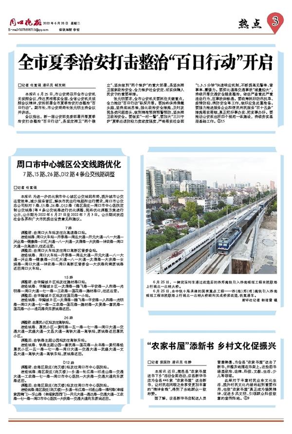 本报讯 为进一步优化我市中心城区公交线网布局,提升城市公交运营效率,减少服务盲区,解决市民出行难题和出行需求,周口市公交总公司拟对7路、15路、26路、D12路(港区段庄—周口市中心医院定制公交线路)等4条公交线路进行优化调整,现将优化调整方案进行公示,公示期为2022年6月27日至2022年7月3日。公示期间欢迎社会各界和广大市民提出宝贵意见和建议。