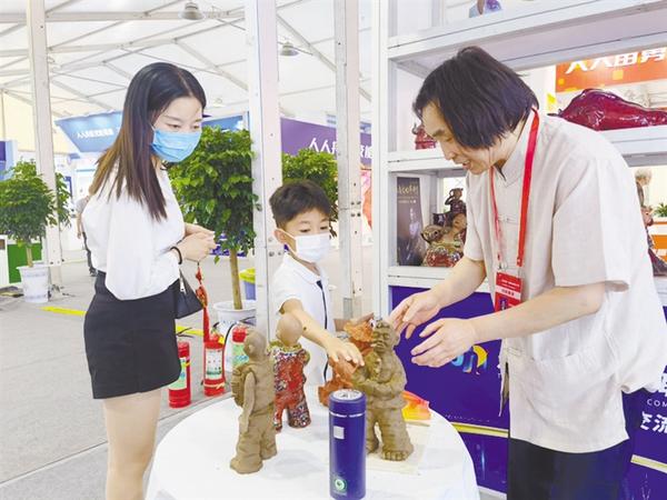 来自周口市的张振福钧瓷泥塑吸引众多观众驻足观看(如图)。张振福现场制作泥塑作品《晒太阳》,作品长13厘米、宽9厘米、高32厘米,塑造了20世纪70年代一位穿着一套旧棉衣、揣着手,憨厚朴实、勤俭节约的农村老汉形象。作品外形夸张、内涵丰富,受到观众一致好评。②11