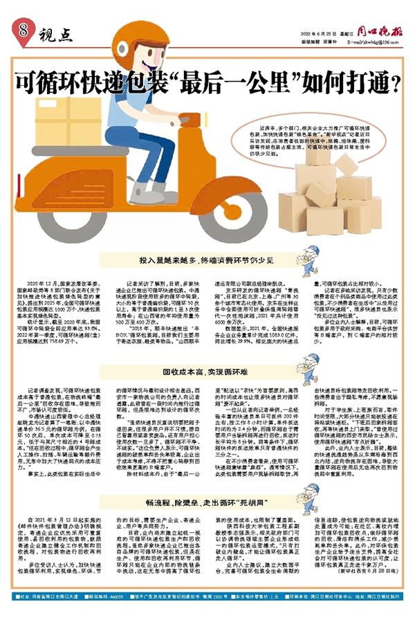 业内人士建议,建立大数据平台,完善可循环包装全生命周期的信息追踪,使包装逆向物流或就地处置成为可能;在社区、高校内增加可循环包装回收点,做好循环箱的回收、清洁和消杀工作,减少损耗率和丢失率。此外,对环保包装生产企业给予适当支持,提高全社会对可循环快递包装的认可度,让循环包装真正走进千家万户。