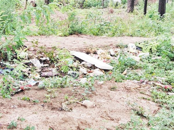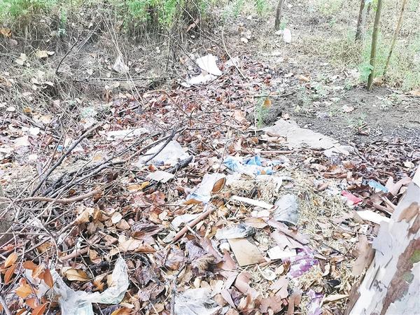 郸城县新城办事处罗楼村后南外环路边树林中大量生活垃圾、枯枝落叶堆积现象