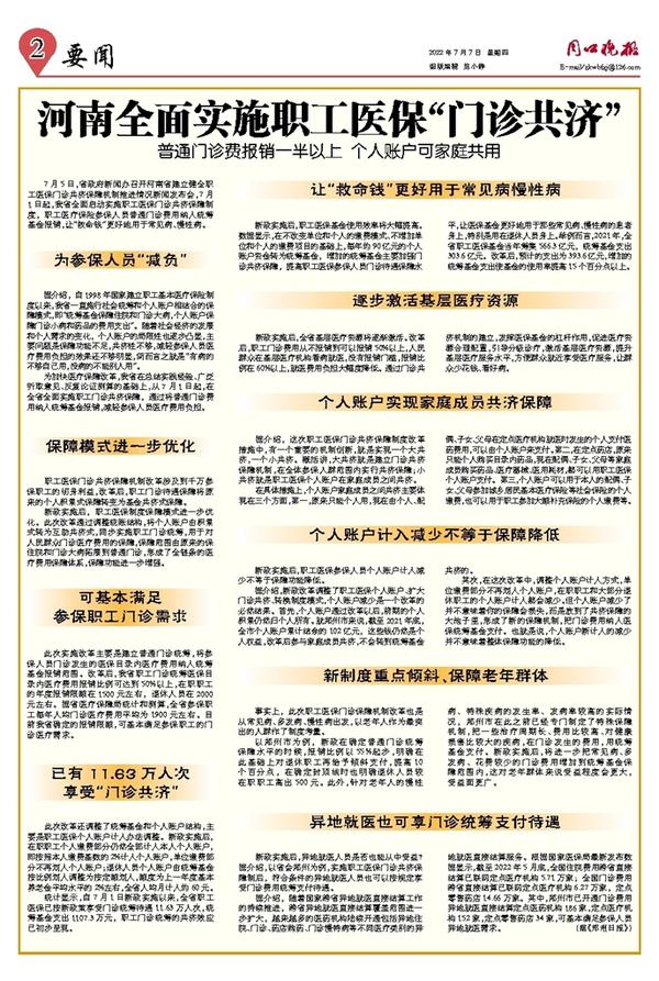 7月5日,省政府新闻办召开河南省建立健全职工医保门诊共济保障机制推进情况新闻发布会,7月1日起,我省全面启动实施职工医保门诊共济保障制度,职工医疗保险参保人员普通门诊费用纳入统筹基金报销,让“救命钱”更好地用于常见病、慢性病。