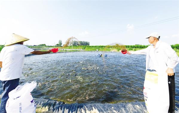 7月9日16时,川汇区城北街道办事处邵火庙行政村豫东渔牧养殖场,工人们正在鱼池边挥汗如雨,按时投放饵料。生猛的清江鱼一时间万头攒动,从深4米、水面面积一亩地大小的漏斗型鱼池中浮出,黑压压地游过来争抢掠食。圆圆的池塘表面,一群头如鲇鱼模样的鱼群,刹那间汹涌翻滚!