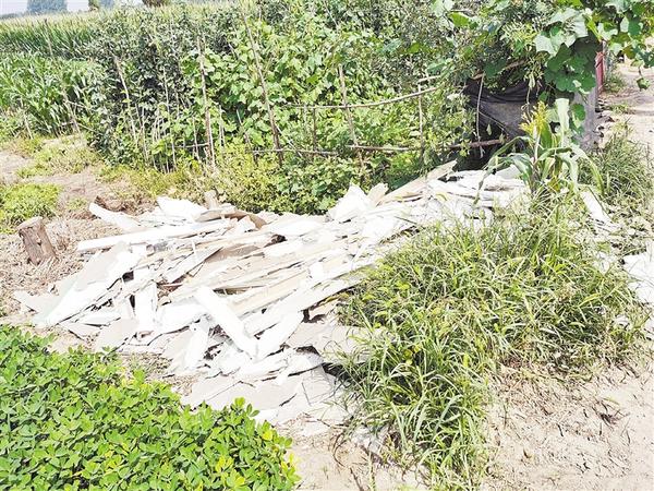 黄泛区农场尹坡村村口存在大量陈年垃圾长期无人清理现象,有一处残垣断壁