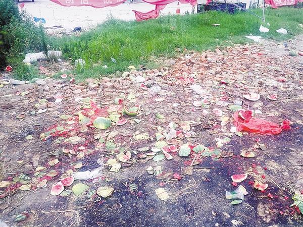黄泛区农场东环路中油加油站附近,地面存在大片西瓜皮和生活垃圾散落现象