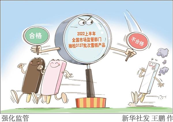 据初步统计,2022年上半年,全国各级市场监管部门共组织监督抽检3137批次雪糕产品,其中检出不合格样品15批次,不合格项目为菌落总数、大肠菌群、单增李斯特菌和蛋白质。 市场监管总局要求各地市场监管部门持续加强对雪糕等冷冻饮品生产经营企业的监督检查和产品监督抽检,严厉查处违法违规行为,保障雪糕等冷冻饮品质量安全。 新华社发 王鹏 作