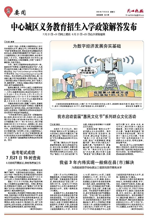 根据省首届“惠民文化节”系列群众文化活动要求,我市按照“政府主导、社会参与、各方支持、群众受益”的原则,以“喜迎二十大 欢乐进万家”为主题,推出“中原舞蹁跹 群星耀中原”周口市第六届艺术广场舞大赛、“唱响新时代 群星耀中原”周口市群众合唱大赛、2022 年“我的乡村文化合作社”才艺大赛、周口市第十五届“群星奖”音乐舞蹈大赛、戏剧曲艺大赛(音乐、舞蹈、戏剧、曲艺四类)、周口市第十八届艺术摄影展、周口市第二届民间艺术大赛、“翰墨丹青迎盛世”周口市美术书法作品展、周口市第十一届少儿才艺大赛、“书香周口”2022 全民阅读活动9大类群众文化活动,唱响主旋律,振奋精气神。