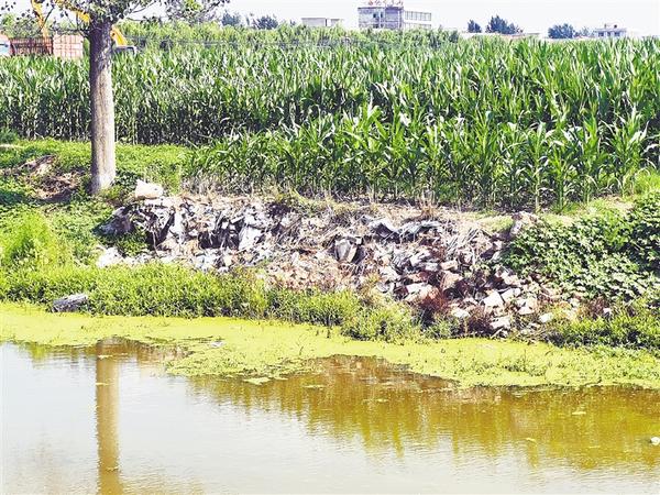 沈丘县槐店回族镇豪庄村内坑塘边有大量陈年垃圾无人清理