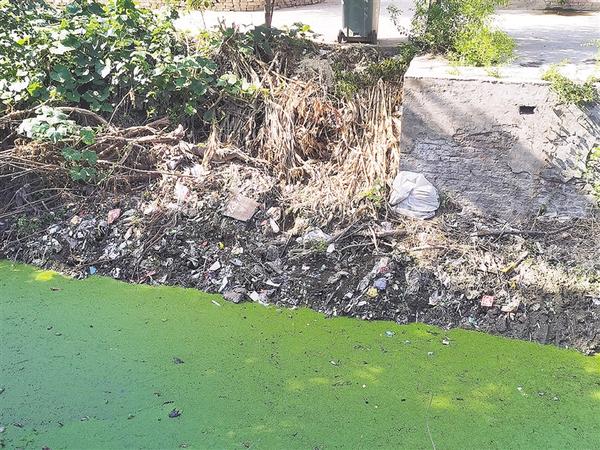 商水县平店乡大姚庄村内沟塘漂浮有白色垃圾、边坡有树枝秸秆堆积