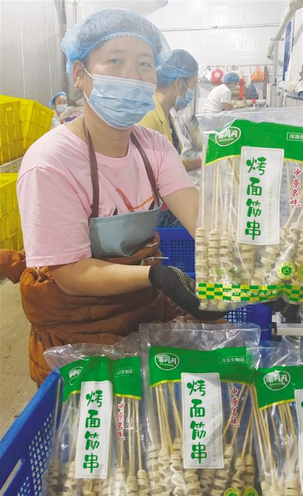 完成这些机器生产工序后,生产出的成批的面筋便被送到车间东侧的穿串工作平台,五六十位工人熟练地用一根根竹签穿着面筋。来自附近椿王村的蔡艳艳和对面坐的李秀琴是婆媳俩,她们一天下来可以穿30余把(每把500根)竹签,1.5万余串面筋。穿一把(每把500根)竹签,可以挣6元。俩人一天挣200元左右,一个月能拿到5000多元。“在家门口干活挣钱的同时,主要能接送孩子上学。王总还给大家免费提供早上和中午两顿饭,照顾我们大家挺好的。”蔡艳艳一脸的笑容写满生活的满足感。