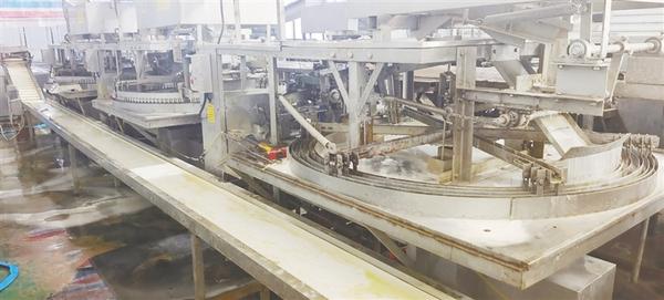 走进车间,一条半自动生产线正在运转,按次序完成和面、醒面、切段、蒸煮、冷却、切花、穿串、速冻、打包、入库等工序。直径近两米的漏斗形的和面机轰鸣作响,醒面、切段、蒸煮、冷却、切花……一条龙生产线井然有序地忙碌着。