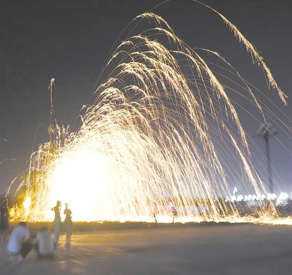 7月30日晚,在淮阳伏羲文化广场,作为2022周口·淮阳文化旅游消费季系列活动之一的国家级非遗项目“打铁花”精彩亮相。借助柳枝搭起的两层“花棚”,艺人们将滚烫的铁水抛打至空中,如烟花绽放,点亮夜空,令人叹为观止。②7