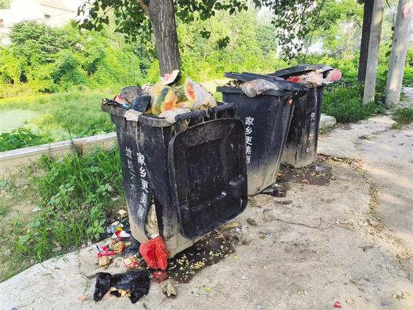 淮阳区刘振屯乡熊楼寨村垃圾桶溢满,旁边散落有生活垃圾