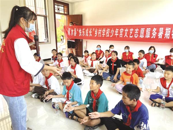 8月3日上午,大学生志愿者为孩子们示范舞蹈动作。当日,商水县新时代文明实践中心的20余名大学生志愿者来到谭庄镇第一小学少年宫,开展文艺志愿服务活动。据了解,为进一步丰富农村孩子的暑期文化生活,深化“童心向党”和“学雷锋 我行动”主题教育实践活动,由商水县新时代文明实践中心牵头,联合多部门在该县各乡镇文明实践站(所)、乡村学校少年宫举办4场文艺志愿服务活动,后续还将继续开展形式不同的志愿服务活动。记者 马治卫 摄