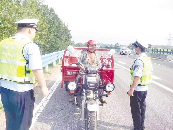本报讯 8月5日,一辆机动三轮车误上高速公路。执勤高速交警驱车赶上,对司机进行教育(如图),并引导该三轮车驾离高速。