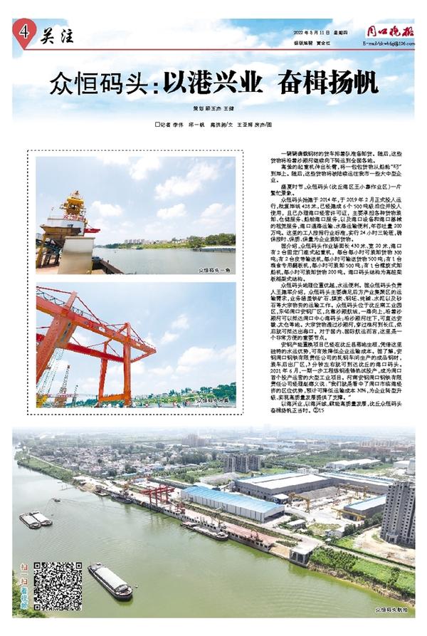 众恒码头始建于2014年,于2019年2月正式投入运行,批复岸线428米,已经建成6个500吨级泊位并投入使用,且已办理港口经营许可证,主要承担各种货物装卸、仓储服务、船舶港口服务,以及港口设备和港口器械的租赁服务,港口道路运输、水路运输便利,年吞吐量200万吨。这里的工人按照行业标准,实行24小时三轮班,确保按时、保质、保量为企业装卸货物。