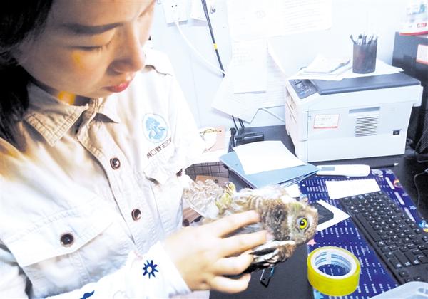 周口市野生动物救护中心专业人员杨露露对这只斑头鸺鹠进行检查伤情后说:“这只斑头鸺鹠内伤严重,需要治疗一段时间才能放归大自然。”
