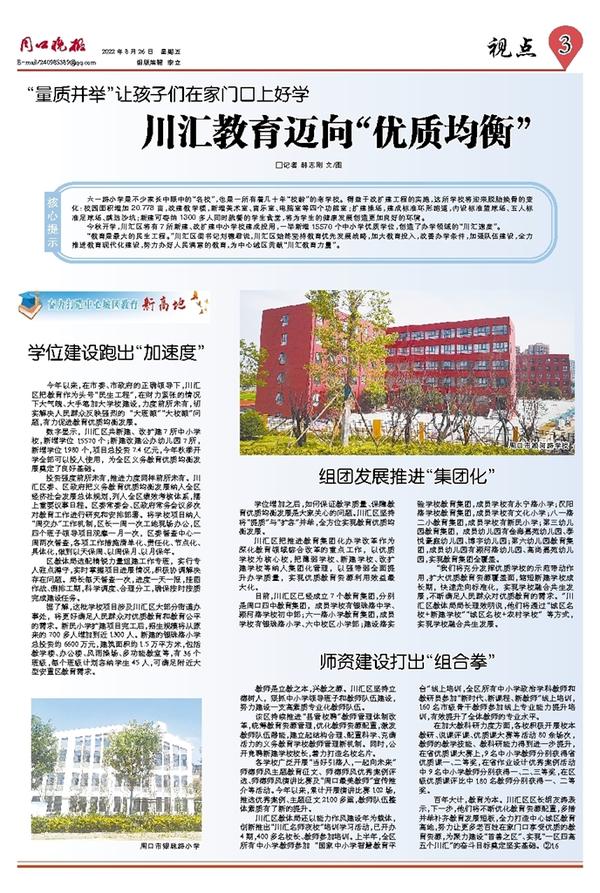 百年大计,教育为本。川汇区区长胡友涛表示,下一步,他们将不断优化教育资源配置,多措并举补齐教育发展短板,全力打造中心城区教育高地,努力让更多老百姓在家门口享受优质的教育资源,为聚力建设“首善之区”、实现“一区四高五个川汇”的奋斗目标奠定坚实基础。②16