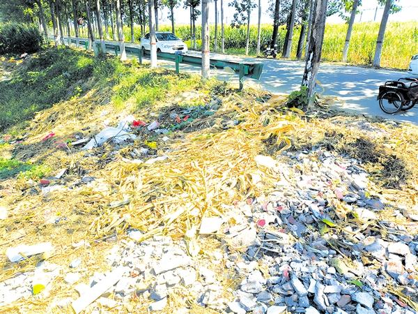 商水县东城办事处小李庄村南两侧有秸秆及建筑垃圾堆放