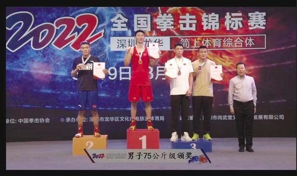 本报讯 8月24日,由中国拳击协会主办的2022年全国拳击锦标赛在深圳龙华闭幕,我市运动员赵蒙洋一路过关斩将,夺得75公斤级男子冠军(如图),王锦文获女子63公斤级第三名。