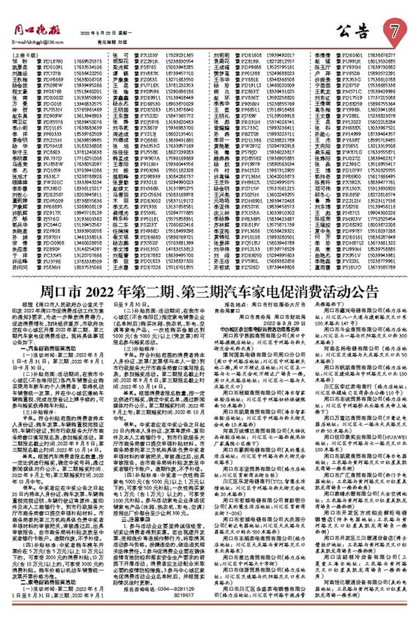 根据《周口市人民政府办公室关于印发2022年周口市促消费活动工作方案的通知》要求,为进一步释放消费潜力,促进消费增长,加快经济复苏,市政府决定在中心城区开展2022年第二期、第三期汽车家电促消费活动。现将具体事项公告如下: