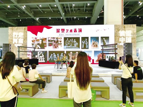 市博物馆在河南展区形象墙通过精品文物和特色展览展示,宣传周口“道德名城、魅力周口”的文化定位,展现周口博物馆风采,彰显新时代博物馆的力量。并携“三皇”月饼、“百忍图赞碑”传拓体验盲盒、青釉剔花杯、豆青釉梅兰同春小屏风、忍·尺、忍·扇等“弘周礼”文创产品在“博博会”上吸粉,观众纷至打卡。郸城泥塑大师张振福代表周口市博物馆进行泥塑非遗展演(如图),传统技艺现场制作让观众惊叹不已。