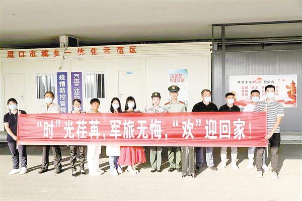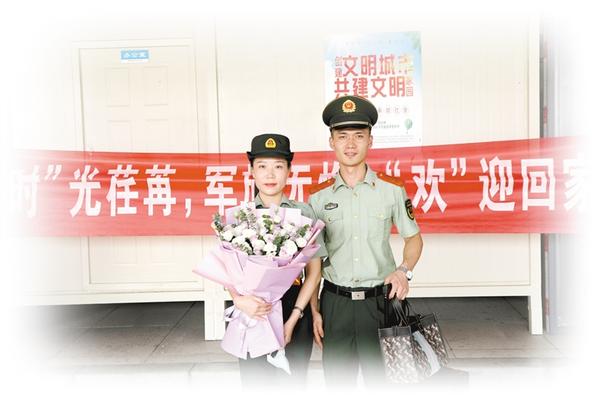 本报讯 带父母、携兄妹、捧鲜花、拉横幅,你光荣退役,我接你回家。9月2日,是武警周口支队二级上士何欢迎接妻子时豆豆退役回家的日子。几天前,何欢就联系亲友策划这场迎接仪式,鲜花、横幅、迎接队伍,和结婚那天一样氛围感拉满,横幅上的“‘时’光荏苒,‘欢’迎回家”,深藏着何欢细腻的心思、暗藏着两个人的名字。