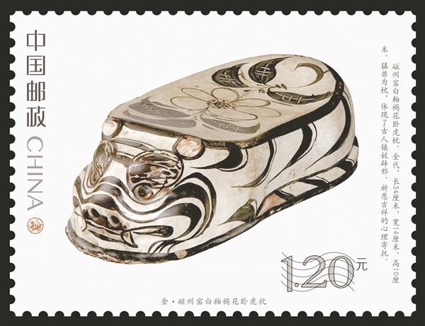 图为中国邮政特别制作的《虎文物》特种邮票之一。9月5日,由中国邮政特别制作的《虎文物》特种邮票正式发行,此套邮票共6枚,每枚邮票上都印有一件珍贵的虎文物。其中,第五枚邮票图案中的“金·磁州窑白釉褐花卧虎枕”是来自周口市博物馆的馆藏珍贵文物。资料图片