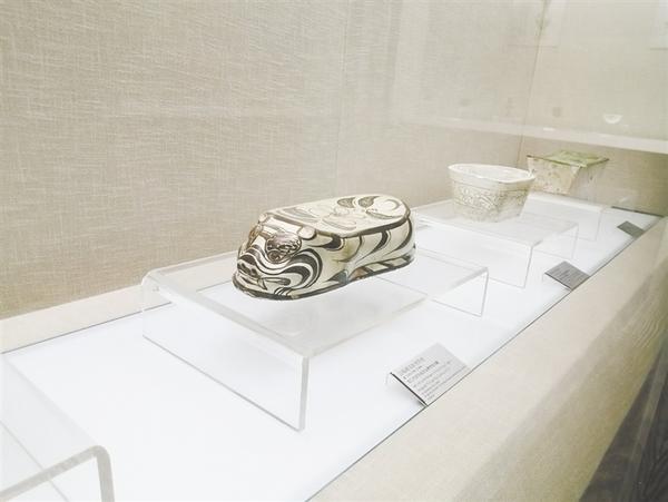 据市博物馆工作人员介绍,这件馆藏金代磁州窑白釉褐花卧虎枕是1978年7月商水县练集乡农民在翻土时发现的。长34厘米,宽14厘米,高10厘米。枕体呈卧虎状,枕面为腰圆形,前高后低,大平底。整器以虎身为枕身,以黑彩绘出虎头形象和虎身条状斑纹,虎鼻为两气孔。以虎背作枕面,其上以黑彩绘折枝花卉,枝叶上饰“丰”字纹叶脉,花朵勾勒流畅,花蕊清晰可见。此枕将虎温驯的状态及折枝花卉和谐地组合在一起,形象生动活泼,情趣盎然,体现了工匠丰富的想象力。据说枕以虎等猛兽为造型,可镇妖避邪、早得贵子。