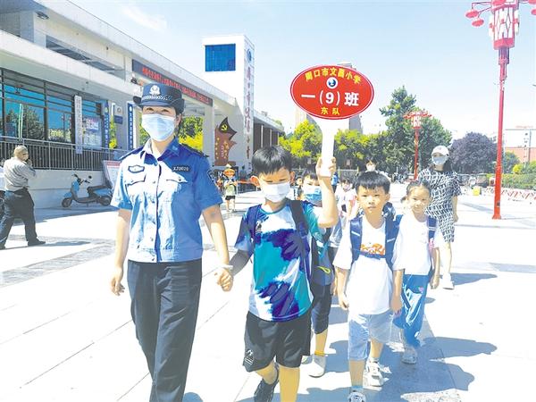 9月6日,周口市文昌小学学生在民警引领下放学回家。为站好秋季护学岗、织密校园“平安网”,市城乡一体化示范区公安分局通过提高见警率、开启“护学岗”、宣传“反电诈”、排查安全隐患等举措,维护校园周边秩序,守护师生平安。记者 姬慧洋 摄