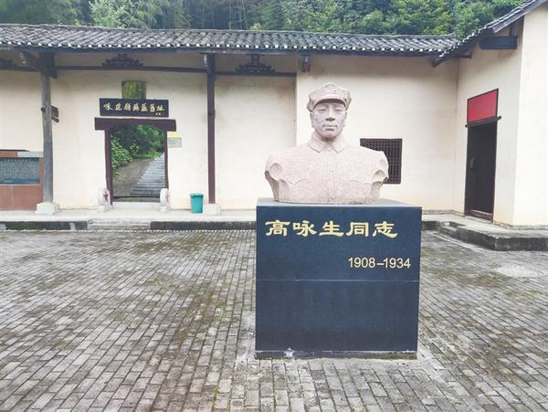 旧址前广场上,有高咏生烈士的石刻雕像。他头戴红军帽,目光如炬,深情地望着远处的苍茫青山,流露出欣慰的笑容。记者轻轻抚摸着雕像,此时此刻,沉默是最好的表达。