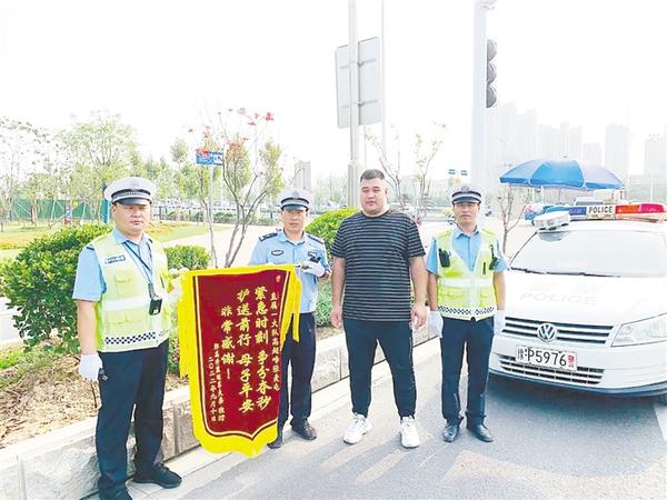 本报讯 还记得豫P5976警这辆警车吗?周口孕妇即将临产向交警求助,警车一路开道将孕妇平安送至医院,进入产房4分钟后,孩子降生,母女平安。郅先生通过自己的抖音账号发布了整个护航过程,抖音视频发布后,受到全网点赞转发。9月13日上午,市民郅先生为表示感谢,他带着一面绣着“紧急时刻争分夺秒,护送前行母子平安。非常感谢!”的锦旗来到中原路与七一路交叉口送到交警手中(如图)。