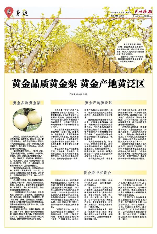 好果品会说话。经历蝶变的黄泛区黄金梨从2013年开始连续5届荣获中国国际农产品交易会参展农产品金奖;2017年入选河南省特色农产品品牌100强;2018年荣获中国安徽名优农产品暨农业产业化交易会参展产品金奖;2020年被评为河南省知名农业品牌农产品品牌;2021年在河南(郑州)国际农业现代博览会上获得金奖。