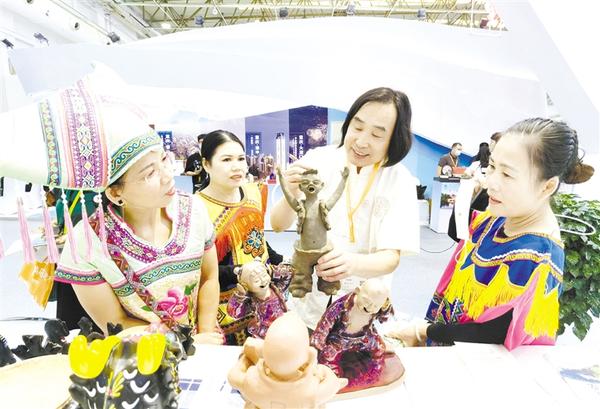 9月19日,郸城县泥塑艺术家张振福向观众展示泥塑制作技艺。当日,由文化和旅游部、广西壮族自治区人民政府共同主办的2022中国-东盟博览会旅游展在广西桂林拉开序幕,张振福应邀携15件泥塑作品参加本次博览会旅游展。记者 徐松 摄