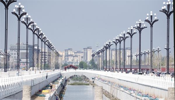9月16日上午,太昊陵景区前,工人们正在两岸华灯栉比的蔡河内施工。经过七八个月的紧张施工,伏羲文化广场的亮化升级、景观改造、增加文化元素等项目建设即将完工,集伏羲文化元素为一体的新广场即将亮相,这里将成为淮阳古城的一处让人流连忘返的文化地标。③19记者 梁照曾 摄