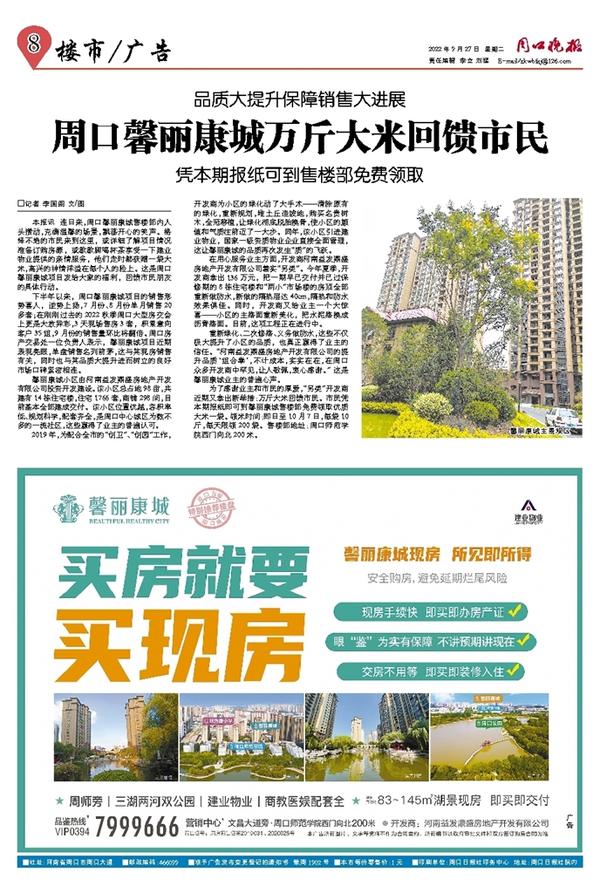 为了感谢业主和市民的厚爱,“另类”开发商近期又拿出新举措:万斤大米回馈市民。市民凭本期报纸即可到馨丽康城售楼部免费领取优质大米一袋。领米时间:即日至10月7日,每袋10斤,每天限领200袋。售楼部地址:周口师范学院西门向北200米。