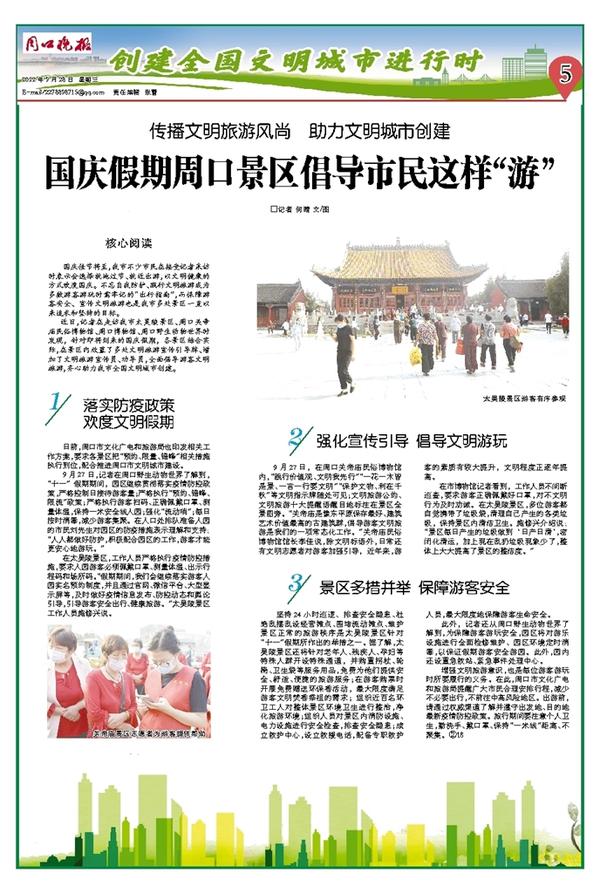 日前,周口市文化广电和旅游局也印发相关工作方案,要求各景区把“预约、限量、错峰”相关措施执行到位,配合推进周口市文明城市建设。