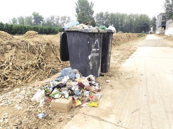 淮阳区柳湖办事处前万庄村村西垃圾箱内垃圾溢出,地上垃圾满地