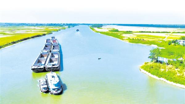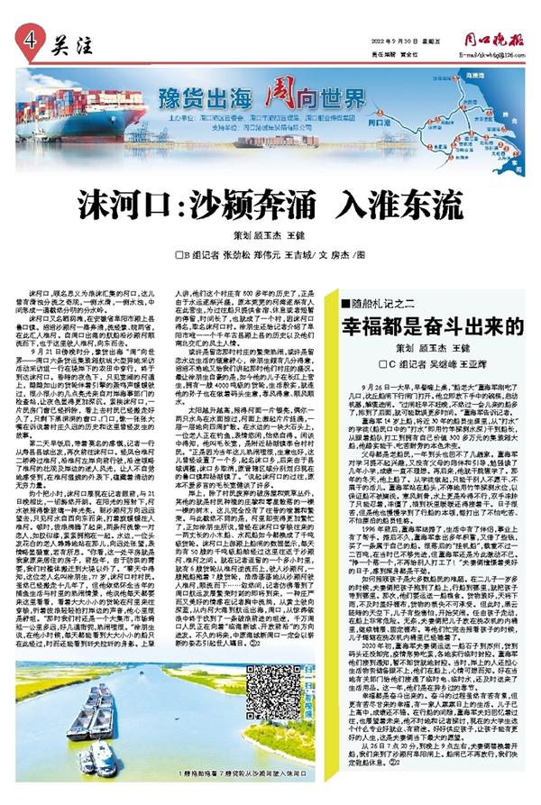 岸上,除了村民废弃的破房屋和荒草丛外,其他的就是村民种植的庄稼和零星散落的一棵一棵的树木,这儿完全没有了往昔的喧嚣和繁荣。与此截然不同的是,河里却变得更加繁忙了,正如徐朋生所说,曾经在沫河口穿梭往来的一两丈长的小木船、水泥船如今都换成了千吨级货轮。沫河口上游颍上船闸的数据显示,每天约有50艘的千吨级船舶经过这里往返于沙颍河、淮河之间。就在记者逗留的一个多小时里,就有6艘货轮从淮河逆流而上,驶入沙颍河,一艘拖船拖着7艘货轮,浩浩荡荡地从沙颍河驶入淮河,顺流而下……忽然间,记者仿佛看到了周口航运发展繁荣时刻的即将到来,一种庄严而又美好的情感在记者胸中流淌,从黄土驶向深蓝,从内河大港到航运出海,周口,从惊涛骇浪中终于找到了一条破浪前进的坦途,千万周口人民正在向着“临港新城、开放前沿”的方向进发。不久的将来,中原港城新周口一定会以崭新的姿态引起世人瞩目。②2
