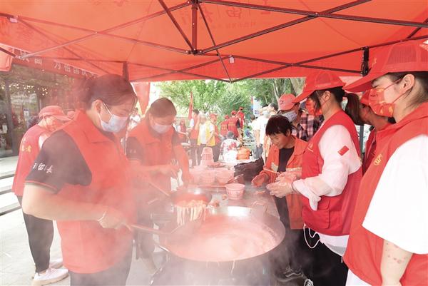 同吃“国庆面”,共祝祖国好。长长的面条、开心的笑脸、真挚的祝福……在活动现场,王留长爱心餐饮企业联合志愿者们生火开灶,为广大群众、一线环卫工人送上1000碗香气腾腾的“国庆面”,让他们在繁忙的工作之余感受国庆的喜悦氛围。
