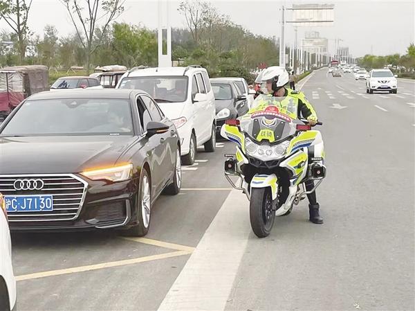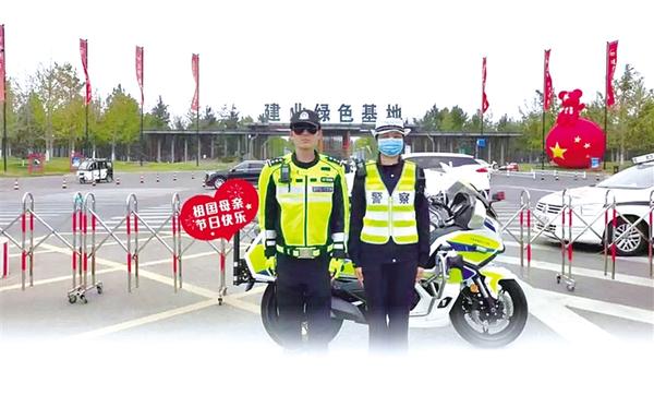 国庆假期的第三天,周口建业绿色基地游客增多、门前车流量大,道路交通压力增大。市交警支队铁骑大队民警曹兴旺接到支援交警三大队的通知后,立即与同事前往绿色基地疏导交通,他的妻子贾璐——交警支队三大队民警,此时也正在现场执勤。夫妻俩简单问候以后就各自忙碌,引导车辆有序通行、按规定停放,经全力疏导,现场交通很快恢复正常。看到交通重新变得井然有序,夫妻俩相视会心一笑。