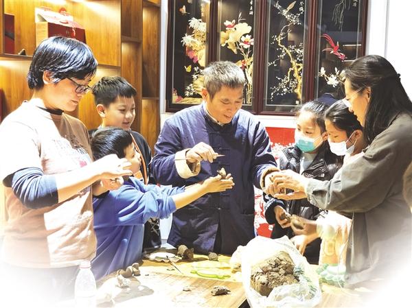 10月8日,淮阳区泥泥狗非遗项目传承人张华伟在周口市非遗协会向孩子们传授泥泥狗制作技艺。“让孩子们在认识非遗、学习非遗中体验传统文化带来的乐趣,加深对本土文化的了解和热爱。”张华伟说。近年来,我市不断探索非遗保护的新路径,通过“非遗进校园”“非遗+研学”等模式,激发广大青少年学习非遗、保护非遗的兴趣和热情。①9记者 刘俊涛 摄