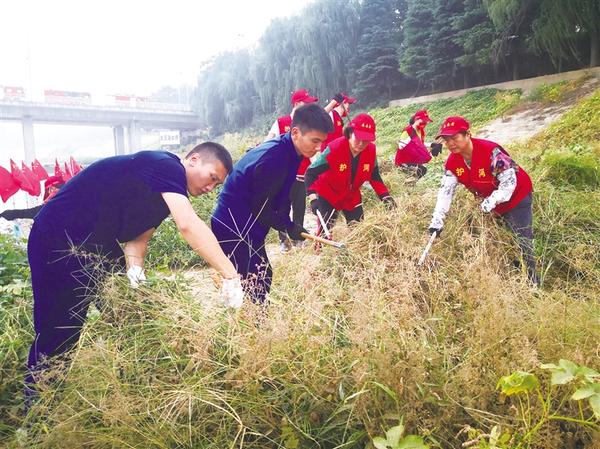 10月2日上午,志愿者手持镰刀清除沙颍河滩上的杂草。当日,周口市消防救援支队、周口市环境保护协会在中心城区沙颍河开展第160次“守护母亲河·环保志愿行”护河活动。百余名消防队员、民间河长手持除草机、铁剪、镰刀等工具,铲除落潮后河滩上的杂草、垃圾。