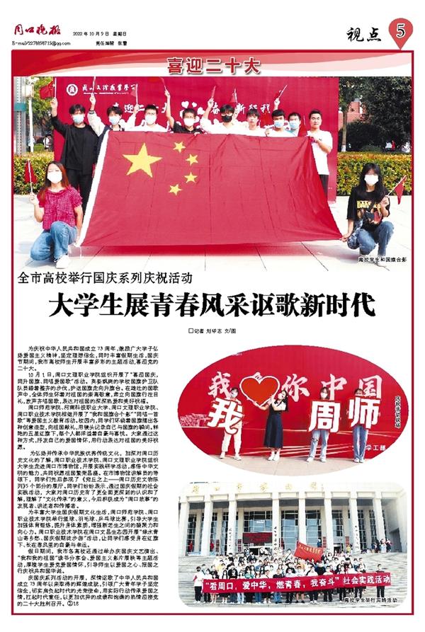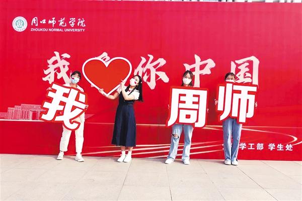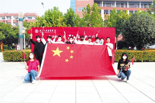 周口师范学院、河南科技职业大学、周口文理职业学院、周口职业技术学院相继开展了“我和国旗合个影”“同唱一首歌”等爱国主义教育活动。校园内,同学们环绕着国旗摆出各种创意造型,向祖国献礼,用镜头记录自己与国旗的瞬间。鲜艳的五星红旗下,每个人都洋溢着自豪与喜悦。大家通过这种方式,抒发自己的爱国情怀,用行动表达对祖国的美好祝愿。