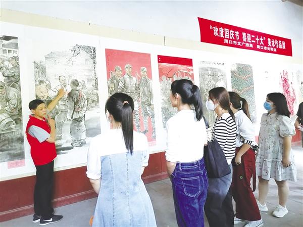 10月3日,在周口市关帝庙民俗博物馆里,川汇区美协主席穆广科(左)向参观者介绍绘画作品。当日,由周口市文化广电和旅游局主办,周口市关帝庙民俗博物馆承办的“翰墨丹青——喜迎党的二十大胜利召开美术作品展”共展出中国画67幅,40余件雕塑作品。