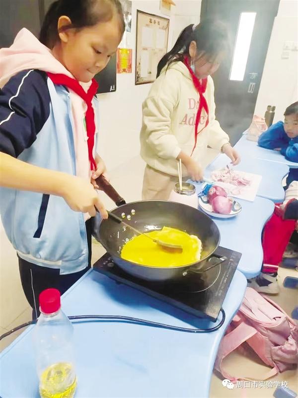 本报讯 10月9日下午,周口市实验学校五(3)班上了一节有声、有色、有味的劳动实践课——教学生炒菜。据了解,此次劳动实践课所用的厨具和食材都是学生自发从家里带的。
