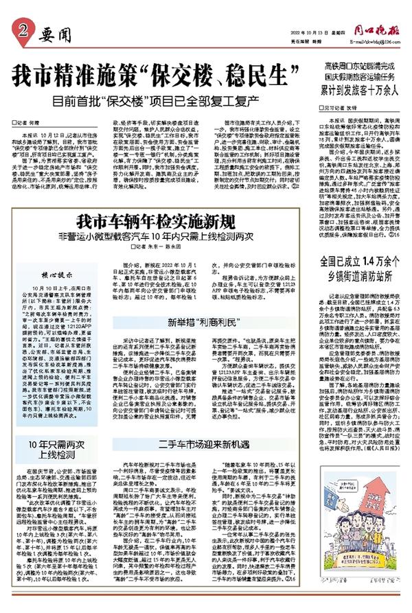 10月10日上午,在周口市公安局交通警察支队车辆管理所(以下简称:车管所)服务大厅内,市民王超为新规点赞:“之前每次车辆年检费时费力,审一次车至少需要一上午的时间,现在通过交管12123APP提前预约,可以错峰办理,更省时省力。”王超的喜悦之情溢于言表。近日,记者从车管所获悉,公安部、市场监管总局、生态环境部、交通运输部四部门发布深化车检改革新措施,推出了优化私家车检验周期、推进网上预约检验、便利二手车交易登记等一系列便民利民措施。我市车管部门按照新规,进一步优化调整非营运小微型载客汽车(9座含9座以下,不含面包车)、摩托车检验周期,10年内只需上线检测两次。
