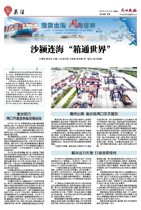 2019年6月6日,河南省首批由水路运输的集装箱货物从周口中心港出发,驶向江苏淮安,经淮安港分拨,发往国内,周口便有了第一条集装箱货运航线。